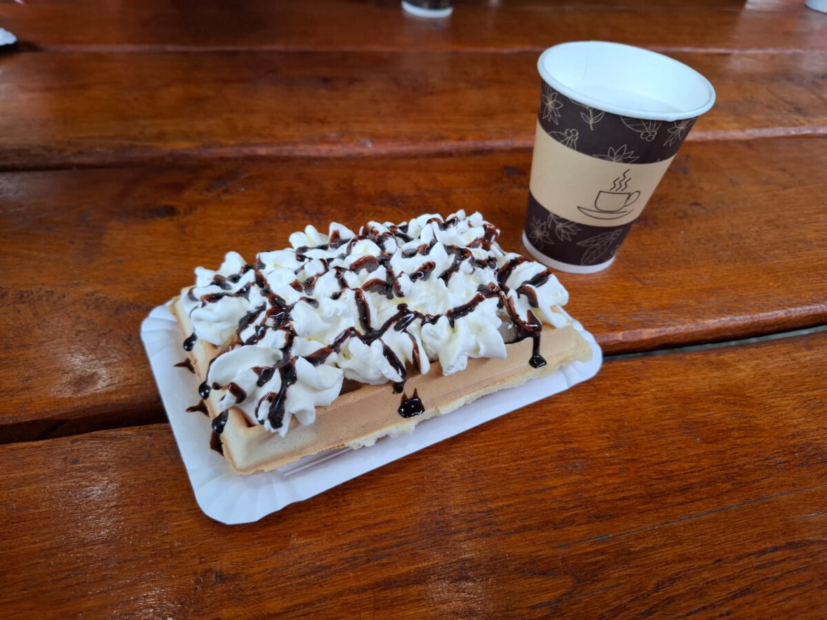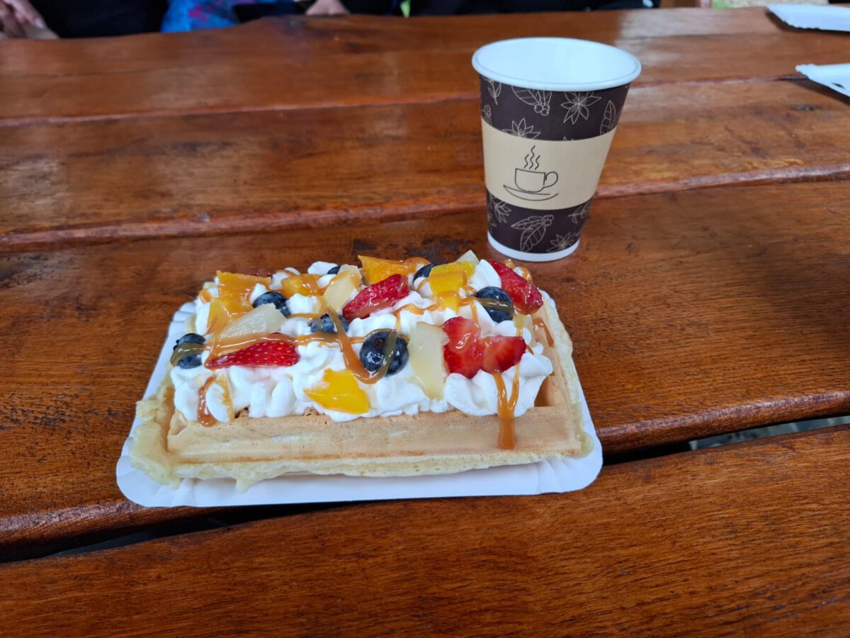 Zapraszamy na gofra z bitą śmietaną, owocami i polewą {↑} toffi lub gofra dubajskiego {↓}.